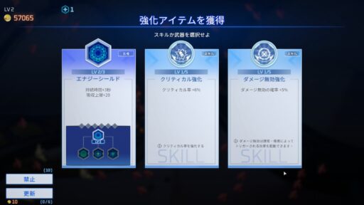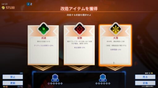 中ボスを撃破すると、改造を手に入れます。どの武器を改造するか選択して装備していきます。